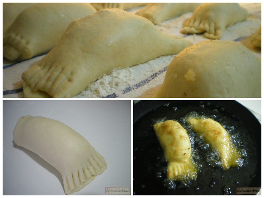 Volvemos a calentarlo y freímos en él las casadielles, poniendo primero hacia abajo la parte donde se junta las dos partes de la masa, para que se sellen.