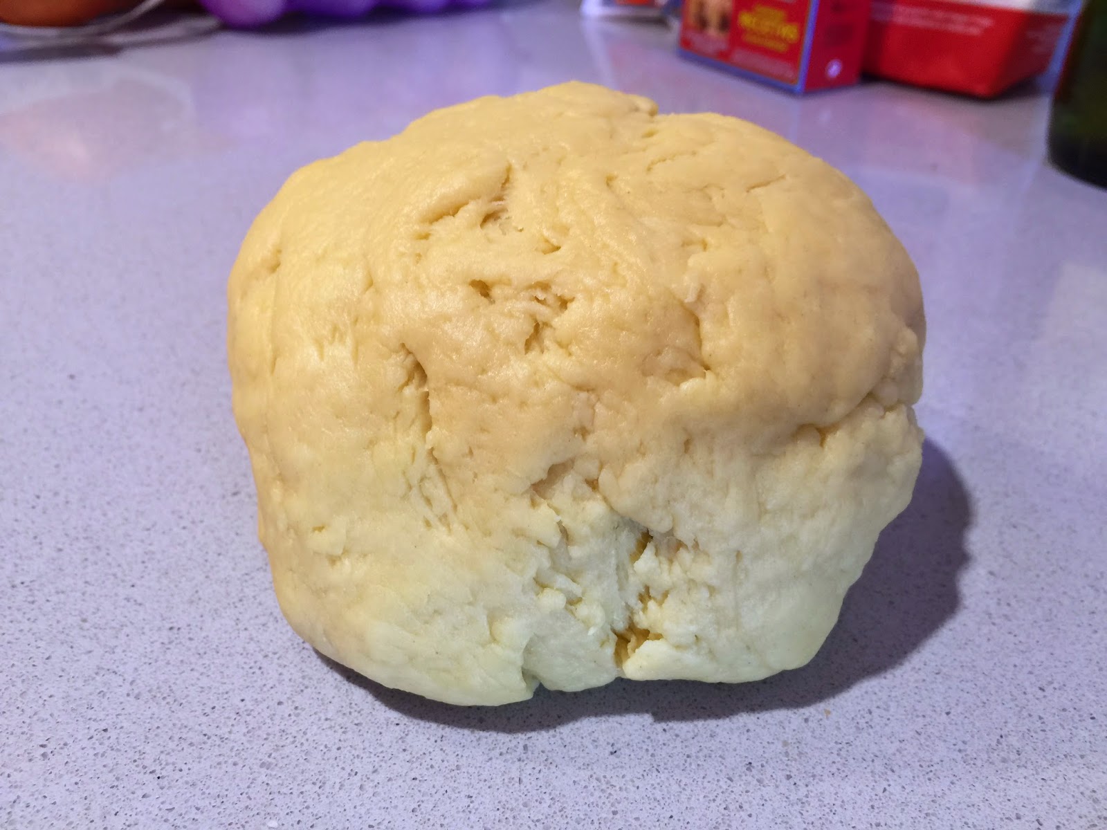4. Por último añadiremos la harina y amasaremos hasta que tome forma de masa. La masa no debe pegarse nada a las manos. Inicialmente es una masa grumosa, pero después del reposo, cambia completamente su forma, convirtiéndose en una masa totalmente lisa.
