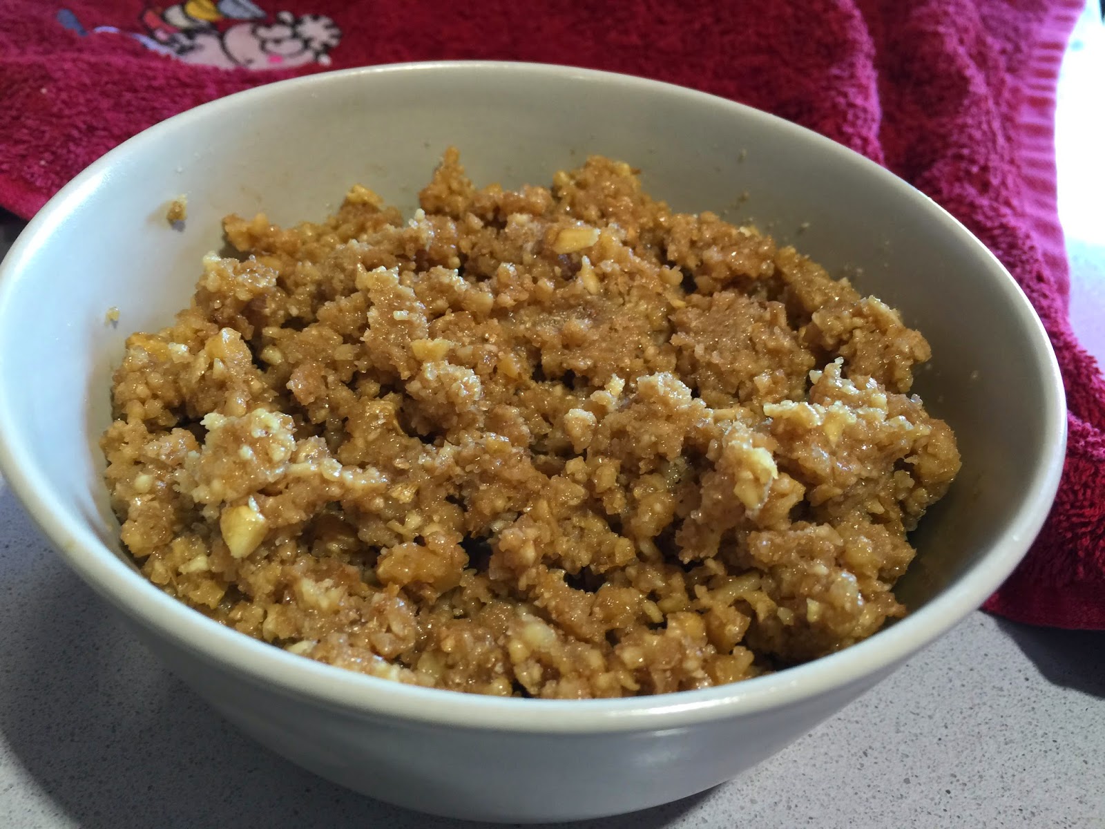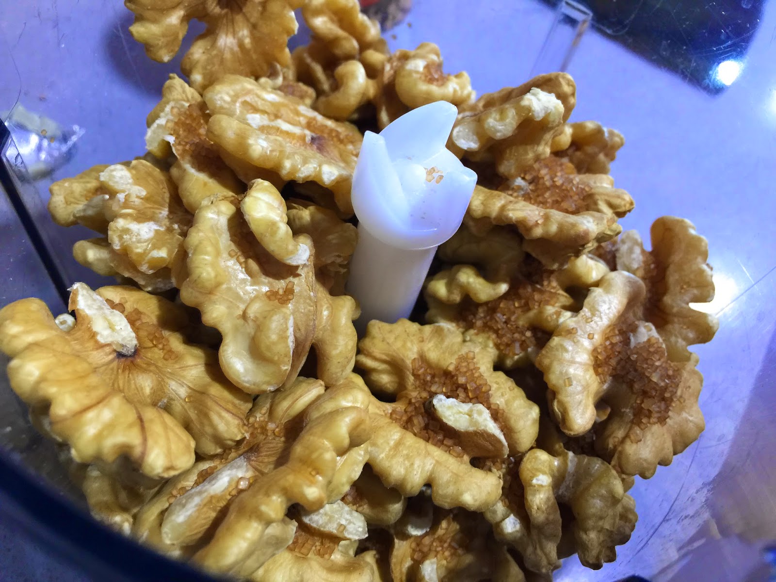 6. Mientras la masa reposa prepararemos el relleno de las casadielles. Pondremos en la trituradora todos los ingredientes del relleno. Las nueces, el azúcar, el anís y el agua. Lo trituraremos hasta que tenga una consistencia de pasta, pero que aún quede algún tropezón de nuez. Lo pondremos en un bol, cubriremos con film y lo dejaremos asentar hasta el momento de rellenarlas.