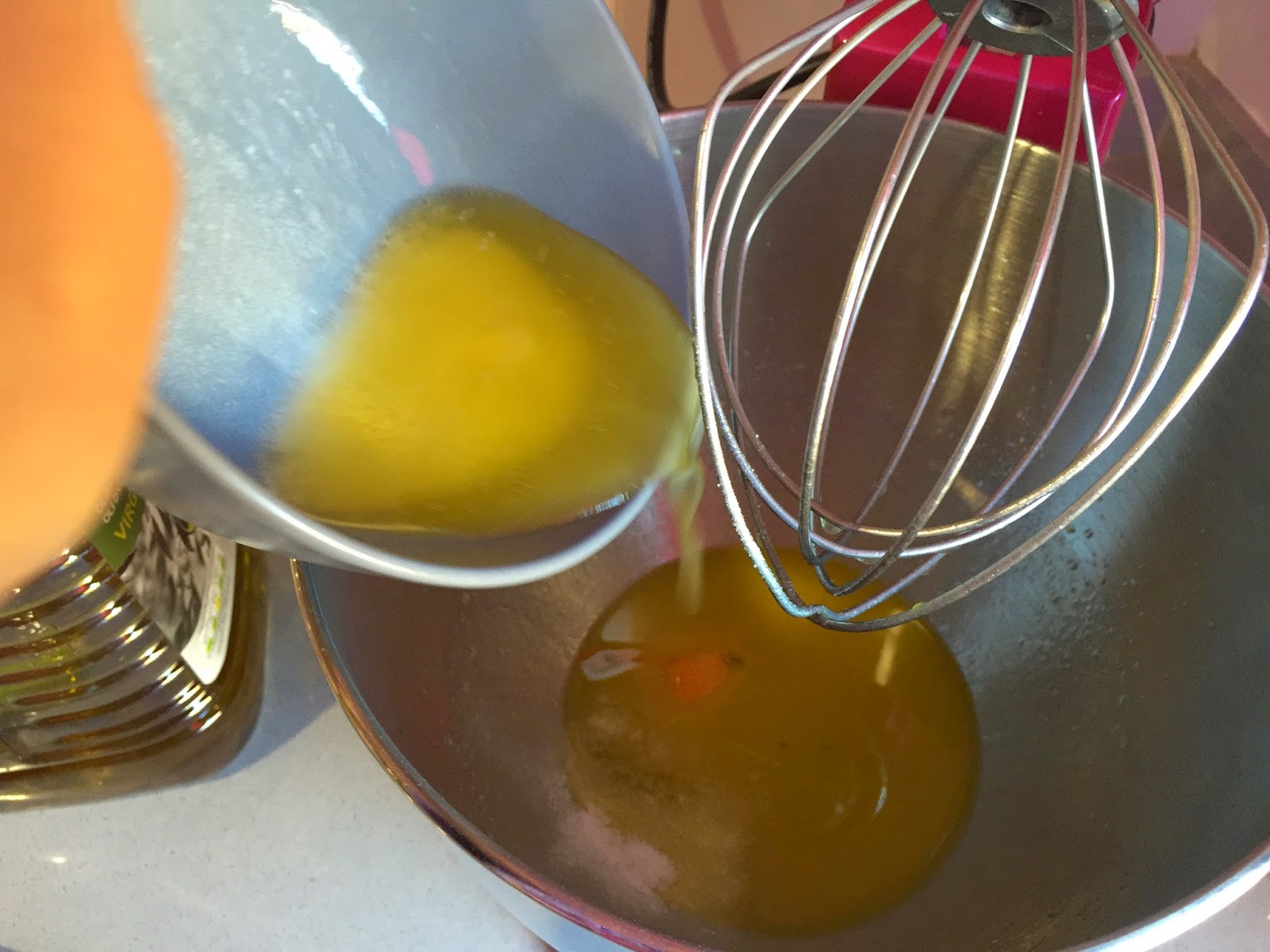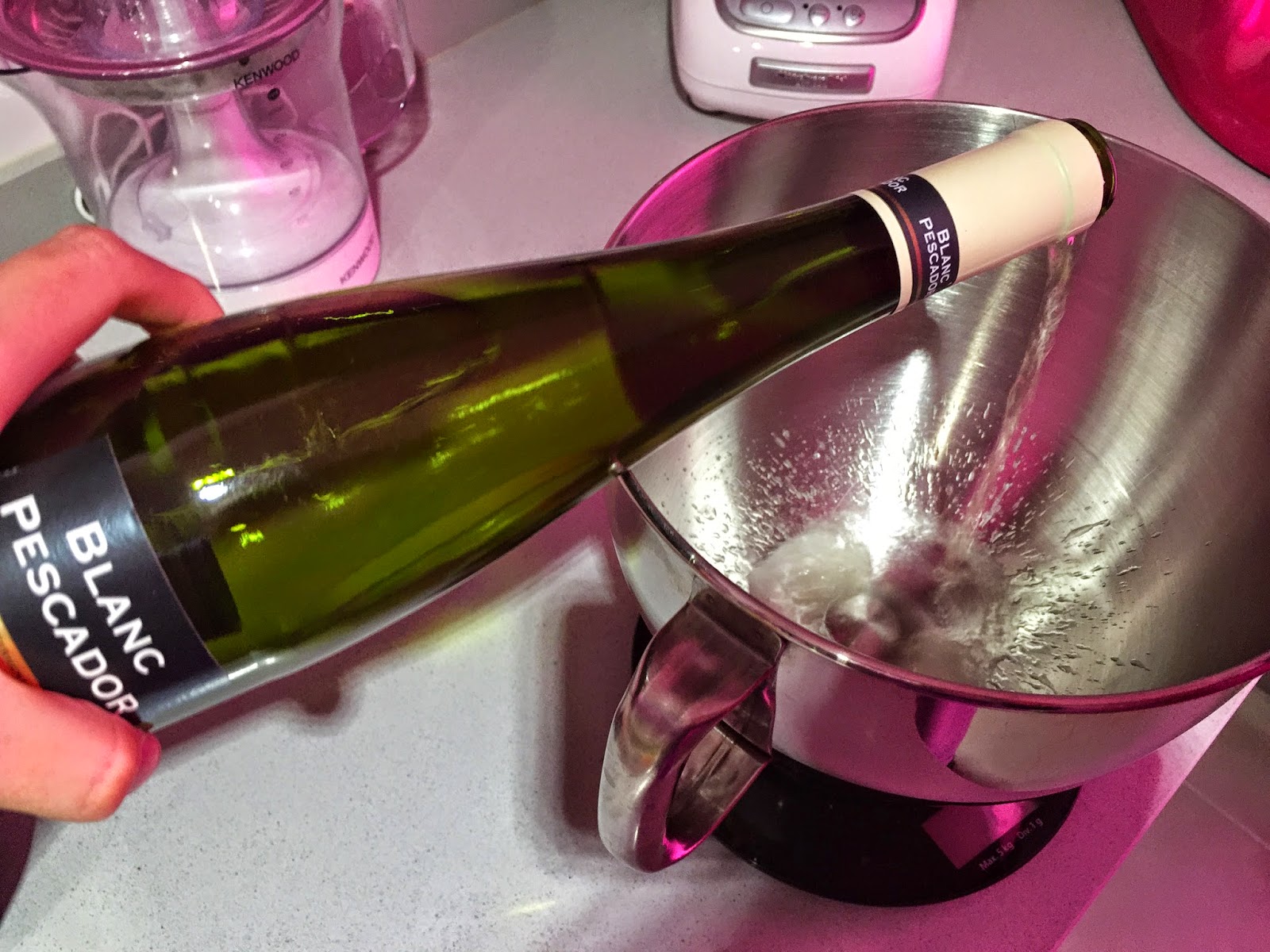 2. Empezaremos a preparar la masa de las casadiellas. Añadiremos al bol los 100ml de vino blanco, junto con el aceite y la sal. Batiremos a velocidad alta hasta que la mezcla emulsione un poco.