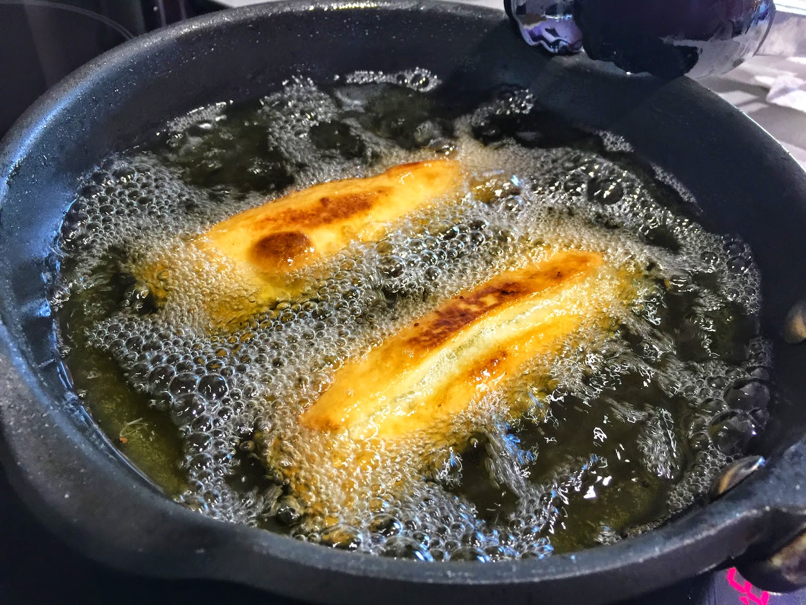 9. Retiraremos del aceite las pieles y la canela y lo pondremos a calentar. Para freír las casadielles no conviene tener el aceite muy alto, porque se dorarían rápidamente por fuera, quedando la masa cruda por dentro. Así que pondremos el aceite a una temperatura media-alta. Yo las he ido friendo de dos en dos. Durante unos 4 minutos por cada lado. Siempre empezaremos poniendo hacia abajo la parte del cierre para que quede sellada y el relleno no se escape. Las iremos retirando a un papel absorbente y rápidamente las rebozaremos de azúcar blanco.