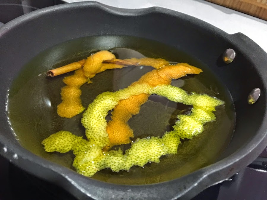 1. Para hacer esta receta empezaremos aromatizando el aceite donde las freiremos una vez hechas. Yo siempre aromatizo los aceite para freír este tipo de dulces, como rosquillas, empanadillas. Lo hacemos con antelación para que el aceite pueda ir cogiendo todos los sabores que le vamos a añadir.