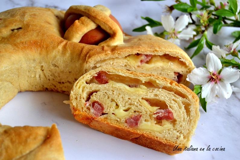 El casatiello es un pan enriquecido con con salchichón y queso. Es una receta tradicional italiana de la zona de Napoles que se prepara para celebrar el domingo santo y el lunes (pasquetta) día en que los italianos solemos salir al campo a comer con los amigos y compartir comidas caseras.Te aviso que esta no es una receta apta para dietas, pero está buenísimo y una vez al año merece la pena prepararlo. La receta tradicional además de los ingredientes de mi receta lleva panceta en daditos, pero a mi gusto me parece suficiente ya con todo lo que trae mi preparación. Para la receta de hoy como verás no he puesto las fotos del paso a paso porque he colgado todo el procedimiento en mi canal de You Tube. Admito que tengo que mejorar. Ten paciencia y dame un poco más de tiempo para hacer mejores videos y soltarme frente a la camara.