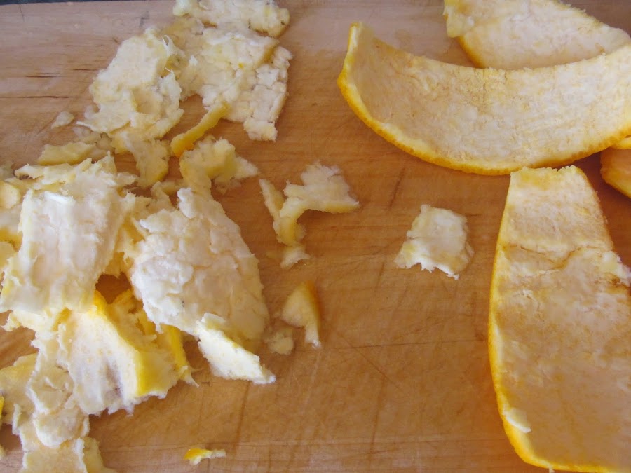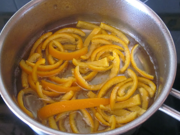 Hacemos bastones, ponemos en un cazo agua y la cáscara de naranja ya hecha bastones, hervimos, desechamos el agua, volvemos a poner agua a hervir y esto lo hacemos tres veces, con estos hervidos, conseguimos, eliminar impurezas que haya en la cáscara y quitar ese amargor típico de la naranja.