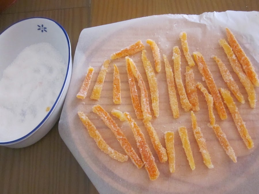 Seguro que habéis visto en las pastelerías las rodajas de naranja confitadas, o los palitos, igualmente confitados y bañados en chocolate, todo un manjar y que ya podemos hacerlo en casa, sin mayor problema que un poco de tiempo.