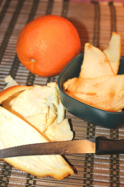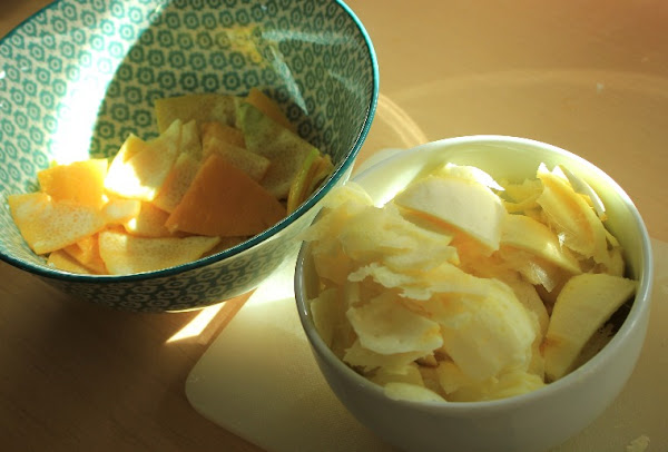 Es tan fácil! debes tomar naranjas orgánicas, te comes la pulpa y usas las cáscaras. Con un cuchillo debes sacar la mayor parte blanca del interior de la cáscara, porque es esta parte que le dá el sabor amargo, no es necesario que lo saques absolutamente todo.