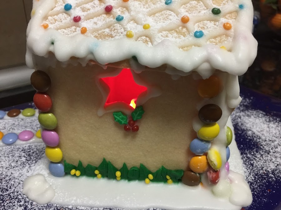 Lo normal es fijar el tejado, poniendo glasa en todos los laterales para que quede más sujeta, pero en mi caso como he puesto una vela de luz led dentro, me interesaba poder encenderla y apagarla