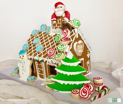 Para el montaje primero unir los laterales y dejar secar, yo lo deje toda la noche. Al día siguiente colocar una parte del tejado con un tope (no hice foto, pero yo le puse unas latas de atún) hasta que se afiance la glasa y no "resvale", pasado unas horas que esté bien seco pegar el otro tejado, la chimenea y las decoraciones que mas os gusten, aquí si que nos pueden ayudar los peques con galletas que pueden haber decorado ellos antes, con caramelos de colores...