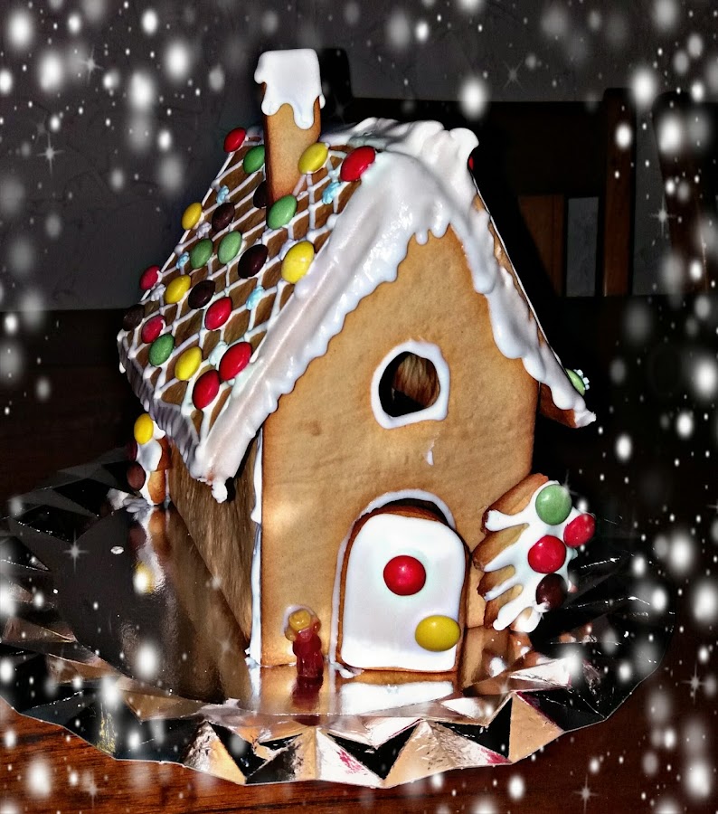 Ahora viene lo mas pesado, pegaremos con glasa la estructura de la casita y la dejaremos secar hasta que este firme, yo me ayude de un elástico y lo deje toda la noche. Después pegamos el tejado y dejamos secar, y por último la chimenea y la puerta que recomiendo esten decoradas.
