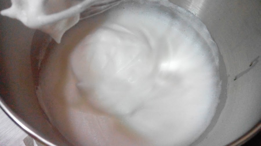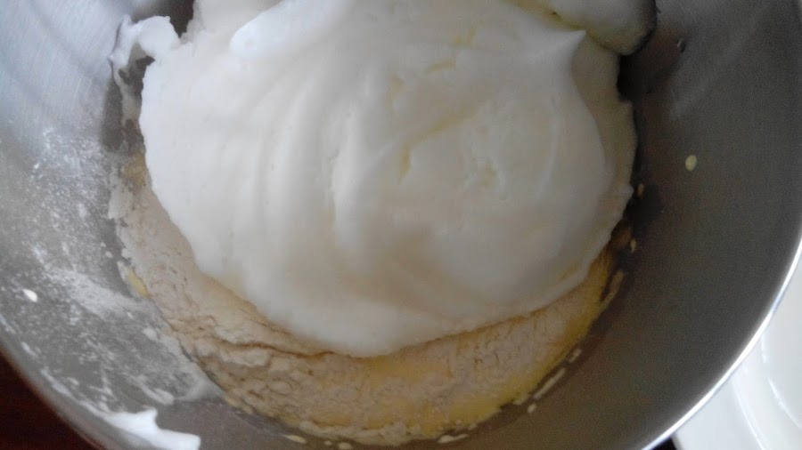Incorporamos las claras a punto de nieve a la mezcla de las yemas con movimientos suaves y envolventes.