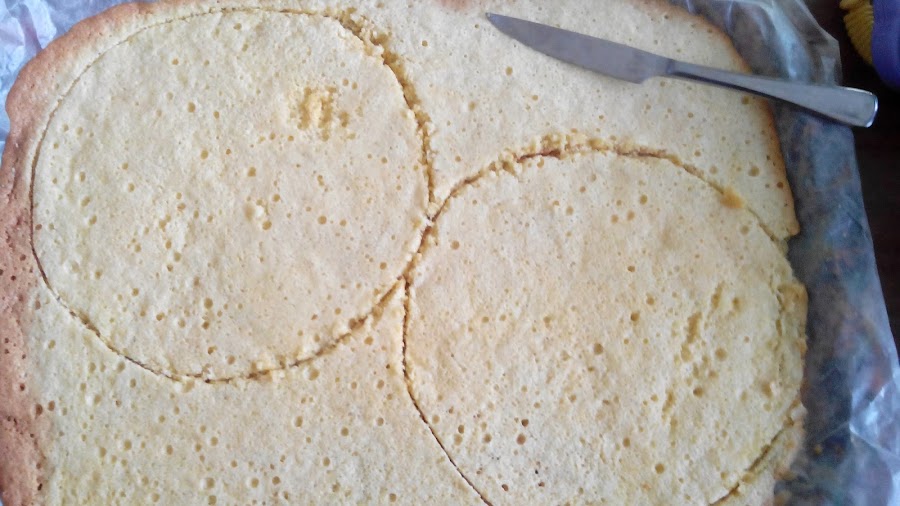 Cuando esté listo el bizcocho cortamos dos círculos iguales con la plantilla que acabamos de preparar y con el resto del bizcocho cortamos pequeños rectángulos para colocar alrededor y formar los bordes del pastel. Reservamos