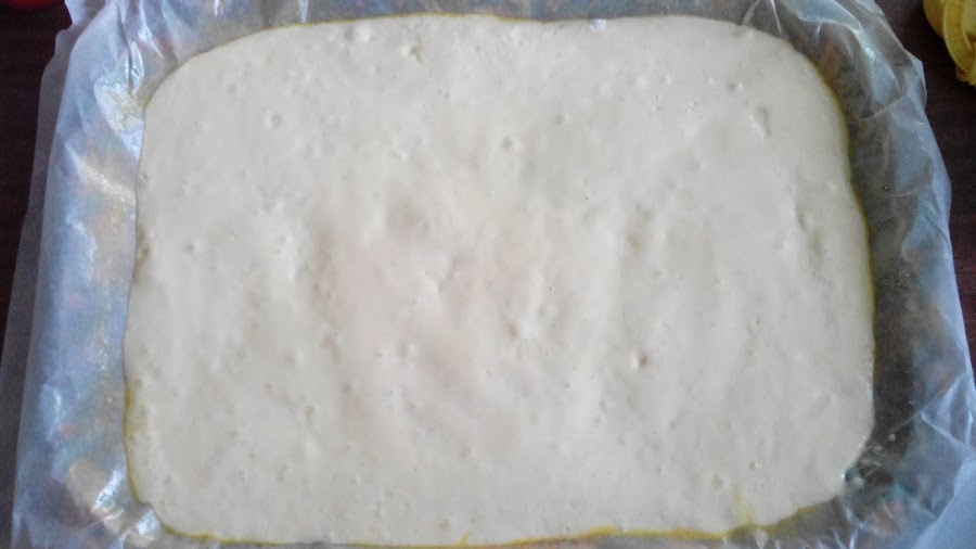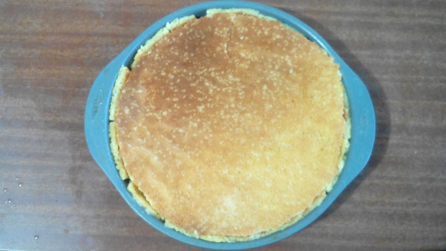 En una bandeja para hornear colocamos papel de cocina y engrasamos. Vertimos la mezcla en él y horneamos a 180°C por 30 minutos o hasta que al insertar un palito salga limpio.
