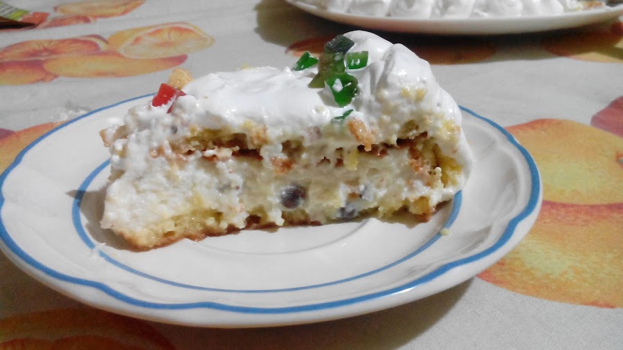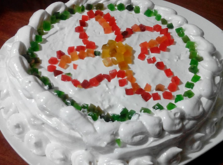 Desmoldamos y emplatamos. Quitamos el papel de cocina de la parte superior y bañamos la torta con glaseado o como yo en este caso con merengue italiano. Decoramos con frutas cristalizadas.
