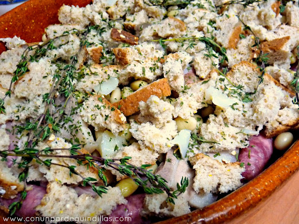3.- Añadimos ahora las hierbas (el tomilloy el romero) en abundancia, colocamos sobre todo ello el pan desmigado y ahora incorporamos el caldo de verduras (podría ser el caldo de la cocción de las judías), pero que no llegue a cubrir y que moje el pan.
