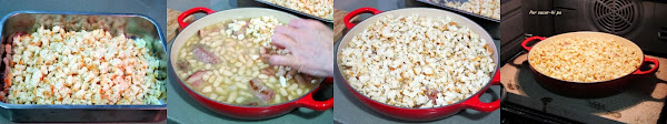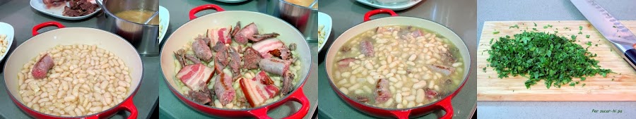 Durante la cocción, vigilar la parte superior y mojar con algo de caldo, rompiendo la costra que se forma. Dicen los guardianes de la tradición que el secreto de este plato es la cocción a fuego lento y que hay que romper la costra siete veces para obtener una excelente cassoulet.