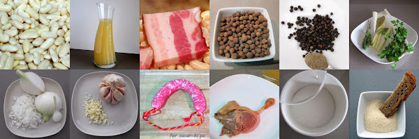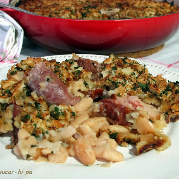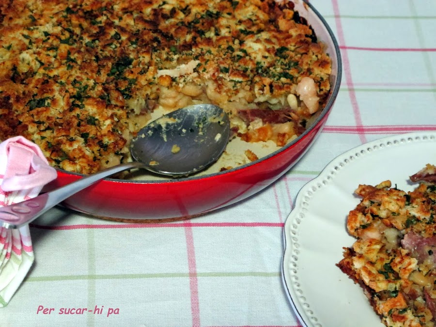 En una cazuela para horno colocar en el fondo la mitad de las judías aproximadamente. Repartir los trozos de bacon, butifarra y confit encima de las judías, y cubrir con el resto de éstas. Por último poner una capa de pan (más o menos la mitad del que hemos preparado). Introducir al horno, a 150º, y cocer durante dos horas.