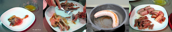 Calentar ligeramente el confit de pato (en el microondas por ejemplo) para que se le desprenda la grasa y la piel, y se pueda trocear. Guardar la grasa.
