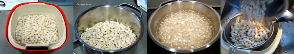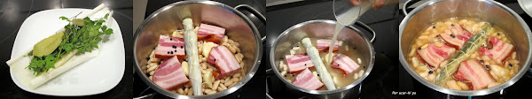 Colocar las judías en una cazuela, incorporar los trozos de bacon, los granos de pimienta negra y de Jamaica, los ajos y el bouquet garni. Cubrir con el caldo de cocido y dejar hervir, tapada a medias, entre una hora y una hora y media a fuego lento, que las judías queden casi cocidas (acabarán de hacese en el horno). Cuando estén listas retirar las hierbas. Reservar los ajos.