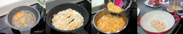 Picar la cebolla y chafar los ajos. En la misma sartén donde hemos cocinado la butifarra, calentar dos o tres cucharadas de la grasa del confit, y dorar la cebolla y los ajos.