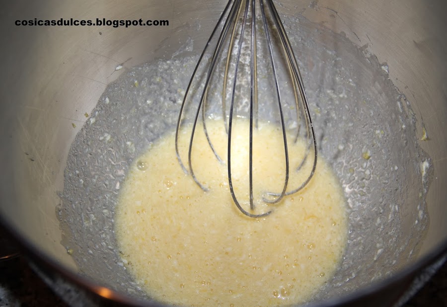 En un bol colocamos los huevos, la mantequilla, el azúcar, el anís y la ralladura y mezclamos bien con ayuda de un batidor manual.