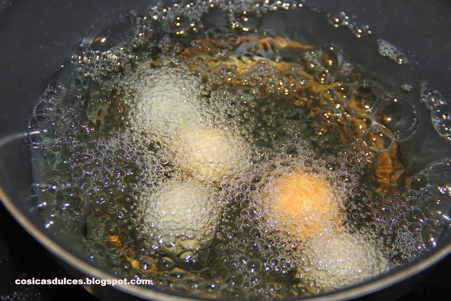 Tomamos porciones de 14 gramos, les damos forma de bolita con las manos y las freimos en abundante aceite de girasol bien caliente.