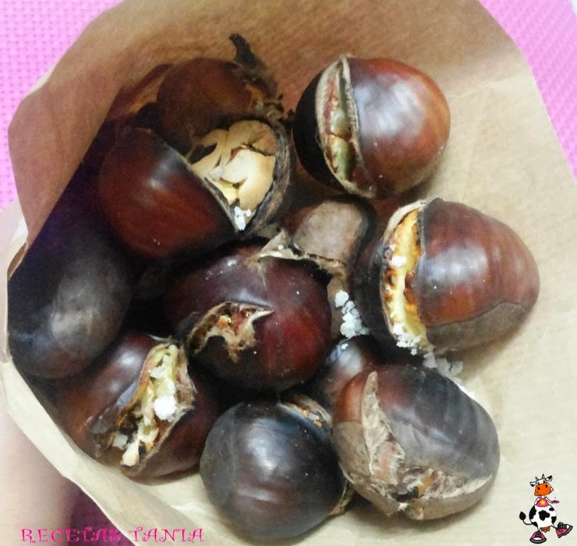 Lavamos las castañas y hacemos una incisión en la cáscara de cada una de ellos. Colocamos las castañas en una bandeja del horno, añadimos sal por encima y ponemos a hornear durante 30 min a unos180º-200º. Colocamos en un cucurucho de papel o en un plato y a disfrutar!!!