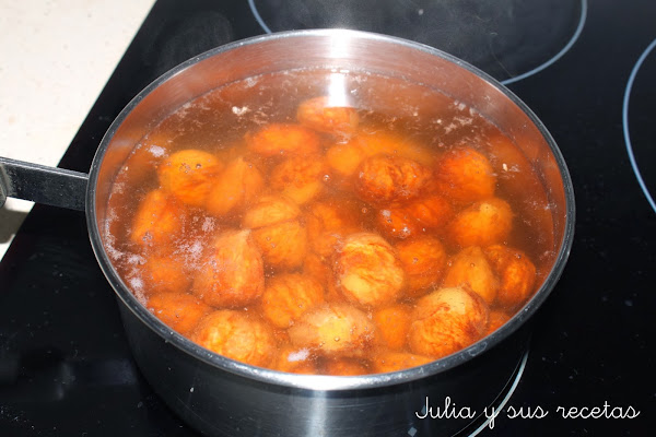 Las vamos sacando poco apoco, de una en una para que no se enfríen del todo, si se enfrían se pelan muy mal y les vamos quitando la piel fina con cuidado de no quemarnos. Las reservamos.
