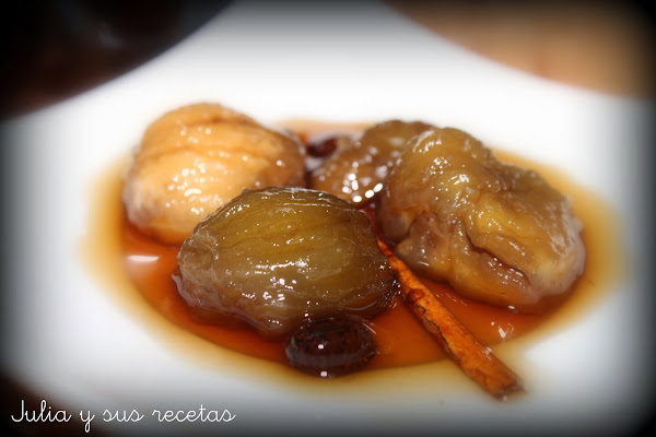 Estamos en época de castañas, y es el momento mas apropiado para realizar postres u otros platos con ellas. Tengo bastantes en casa, he congelado unas pocas ya peladas para hacer cremas y el resto las he puesto en almíbar, con ellas se puede preparar muchos postres. Ademas así, metidas en tarros y poniéndolos al baño maría se conservan durante mucho tiempo. Ingredientes:
