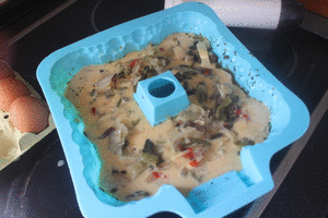Untamos con el orégano hidratado en aceite un molde de silicona (en mi caso con forma de castillo) y volcamos toda la mezcla que hemos triturado en su interior.