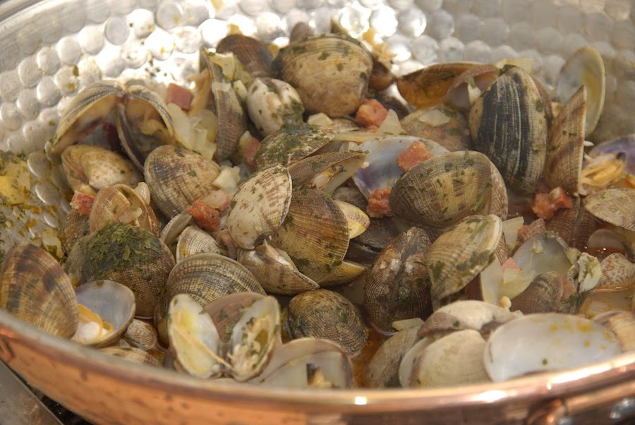 Añadir la guindilla, el vino, el perejil y las almejas. Cerrar la cataplana y dejar cocer todo 10 minutos.