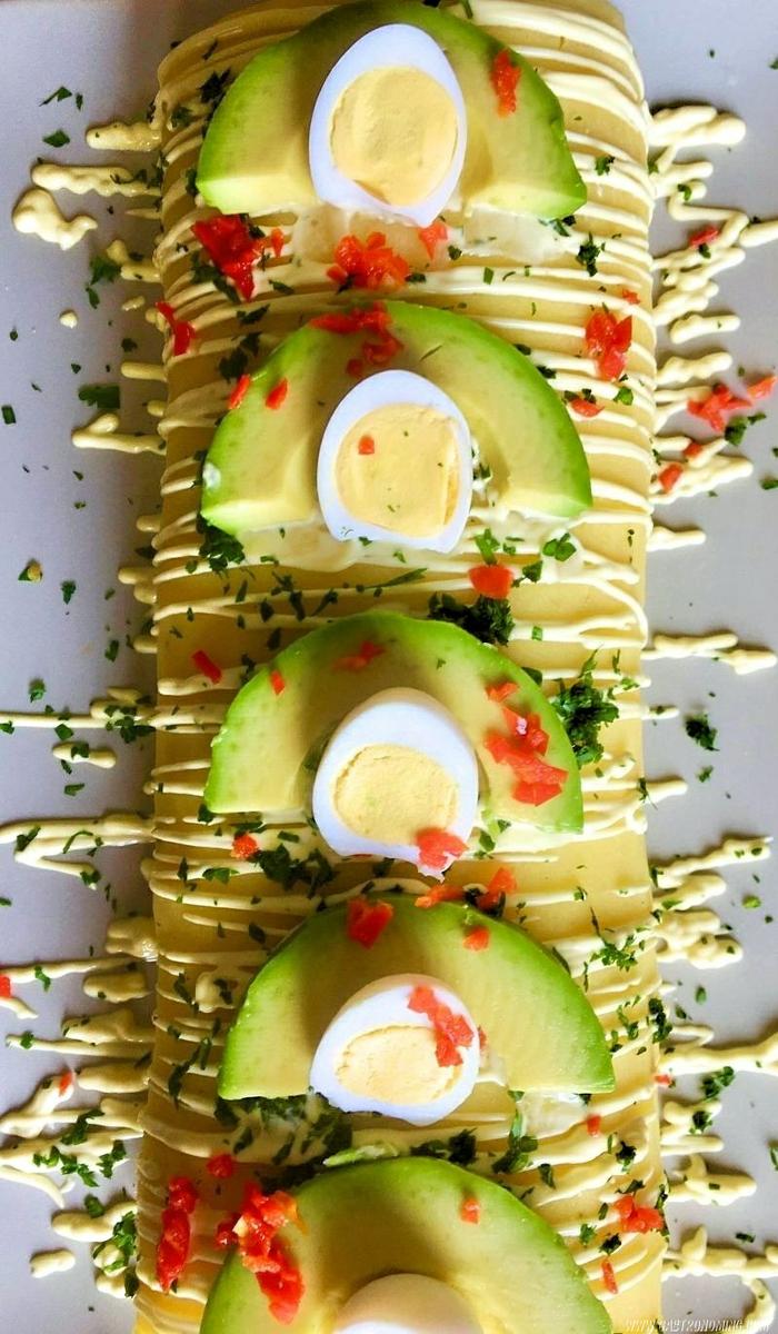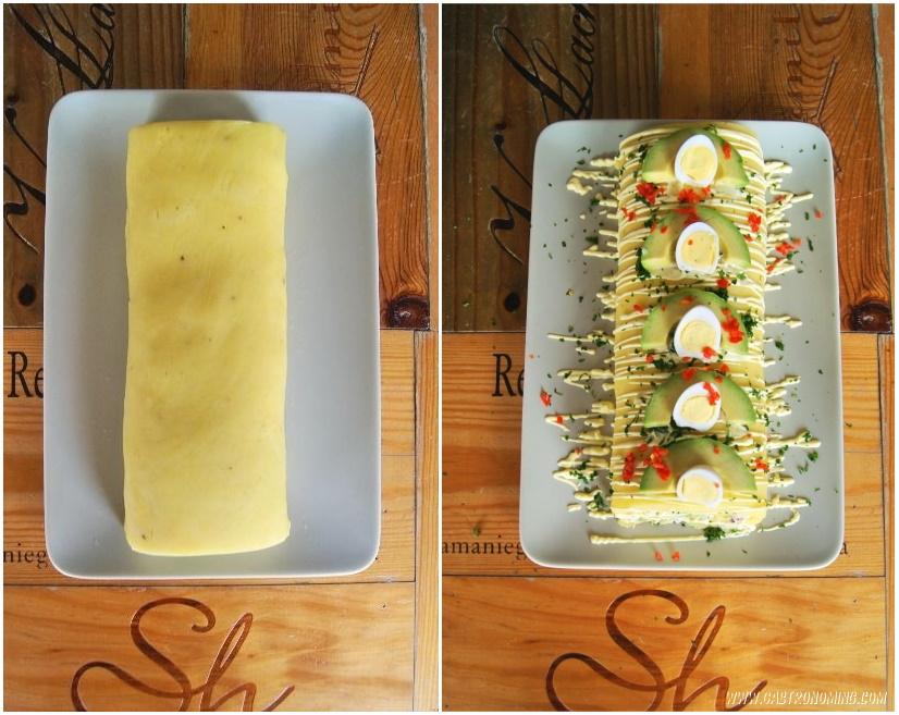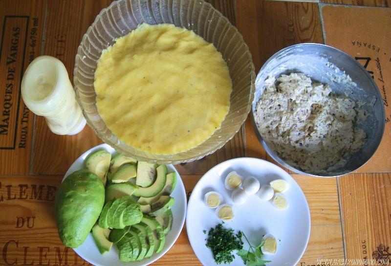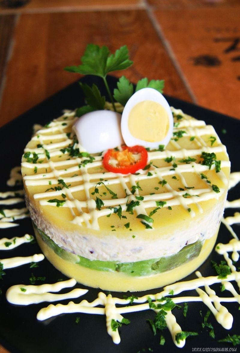 Este plato es hecho con una base de papas amarilla, un tipo de patata peruana difícil de encontrar fuera del país, pero esto no impide que no puedas hacerlo con el tipo de patata con más almidón que puedas encontrar, si bien es cierto el sabor no será el mismo, seguro que la textura podrás imitarla, es lo que hay que hacer cuando no encontramos un ingrediente, lo sustituimos como algún otro que tengamos a mano pero tratando siempre de respetar las recetas tradicionales. Para decorar este plato se usan varios ingredientes, como el huevo cocido, en ocasiones picado finamente para cubrir la superficie toda, tiras de pimiento rojo asado, tomates cherry, más aguacate, olivas botija, un tipo de aceituna llevada por los españoles y que es muy usada en la cocina peruana, el infaltable perejil, algo más de mayonesa o mayonesa de aceituna negra hecha con la “botija”.**Las pechugas de pollo puedes cocinarlas en 2-3 litros agua y añade una zanahoria, una cebolla, un trozo de puerro y alguna rama de apio, no solo saborizarás el pollo sino que también obtendrás un rico caldo de pollo rápido que podrás usar para otra preparación, puedes verlo en la preparación del Ají de gallina.