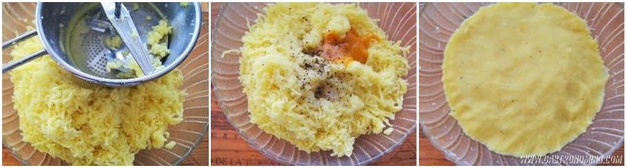 Para la base de patata:1. Ponemos a cocinar en agua las patatas hasta que estén totalmente cocidas, sacamos, pelamos y prensamos con ayuda de un pasapuré, dejamos que enfríe.