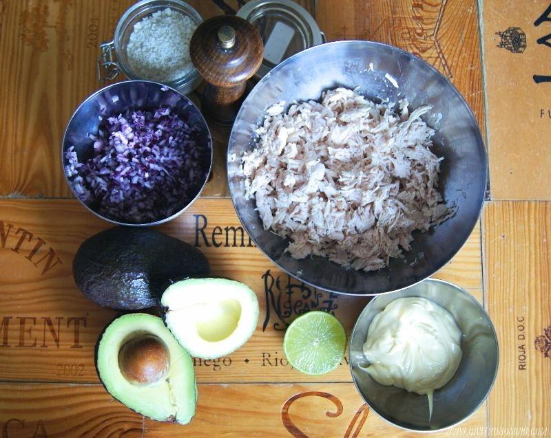 Una vez cocidas y desmigadas las pechugas, en un bol las mezclamos con la cebolla, una pizca de sal y mayonesa hasta crear una farsa homogénea y densa.Para el montaje