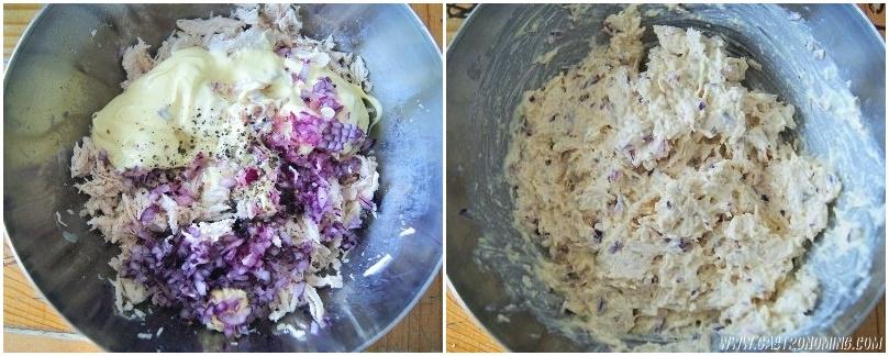 4. Una vez cocidas y desmigadas las pechugas, en un bol las mezclamos con la cebolla, una pizca de sal y mayonesa hasta crear una farsa homogénea y densa.