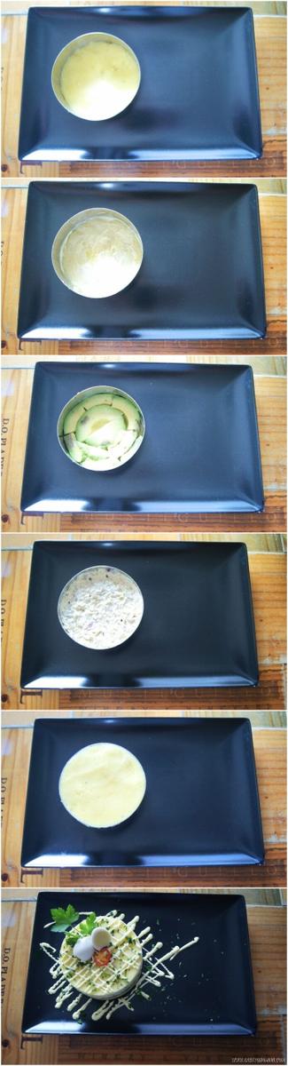 Independientemente de que la hagamos en un molde grande o individual debemos seguir los mismos pasos, vamos a dividir las base de patata en dos partes iguales, una la usamos para poner en la base formando una capa de aproximadamente 1 centímetro de grosor, le untamos una fina capa de mayonesa y cubrimos con una capa de las tiras de aguacate.Encima del aguacate vamos a poner una capa generosa de la farsa de pollo y volvemos a cubrir con la mezcla de patata por encima. Mira las fotos para hacer las dos versiones de presentación.