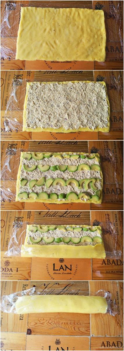 6. Encima del aguacate vamos a poner una capa generosa de la farsa de pollo y volvemos a cubrir con la mezcla de patata por encima. Mira las fotos para hacer las dos versiones de presentación.
