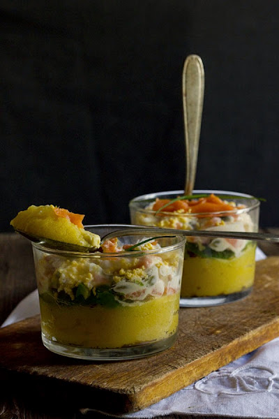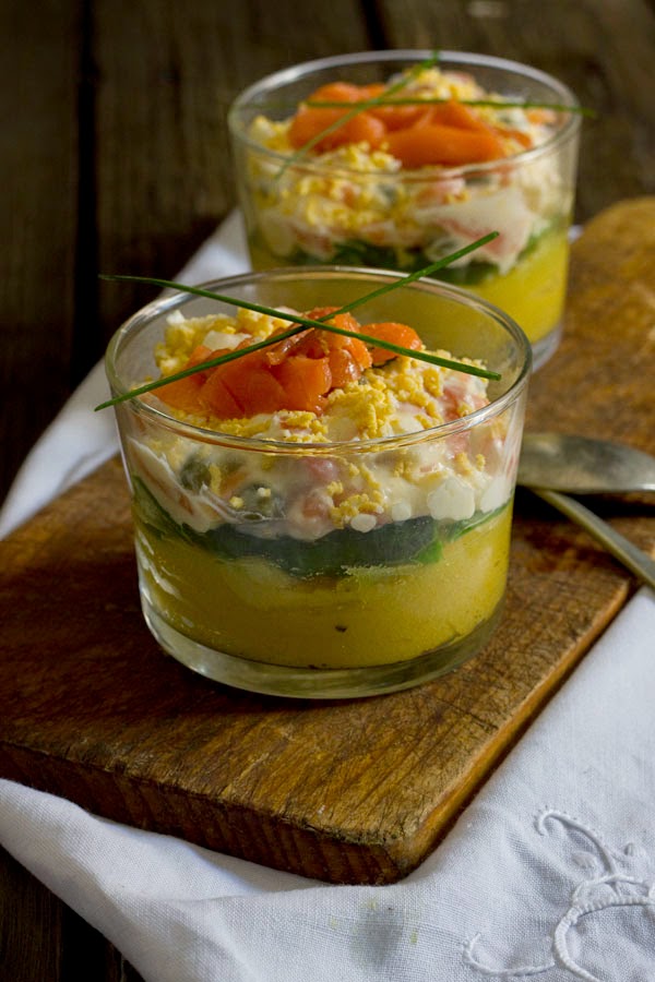 Emplatamos bien con un aro, o como en éste caso, en un vaso, poniendo en primer lugar una capa con el puré, seguidamente otra capa de aguacate y por último otra de salmón. Si preferís ajustaros mas a la causa original, rematáis con otra capa de patata.