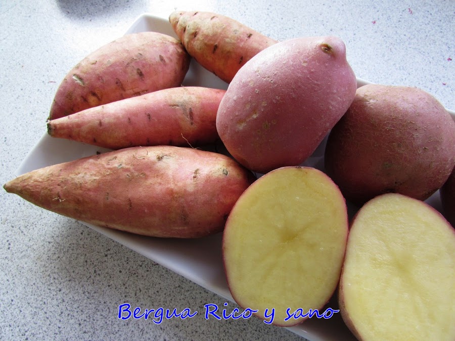 1. Lo primero de todo es cocer la patata y el boniato (con piel). Los podemos cocer juntos con sal durante 15-20 minutos.