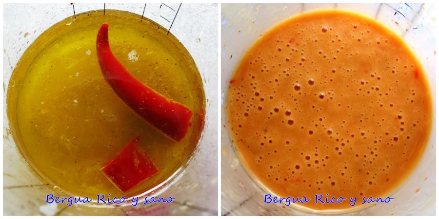 5. En el vaso de la batidora licuamos el aceite, el limón, la guindilla, la sal y la pimienta. Se emulsiona y queda de una textura que recuerda al alioli, pero más líquido.