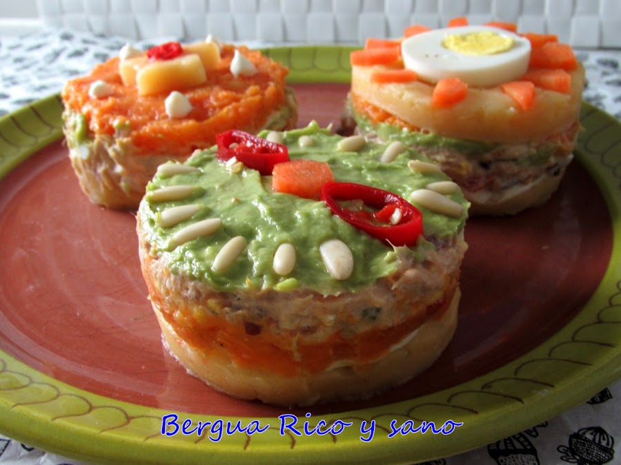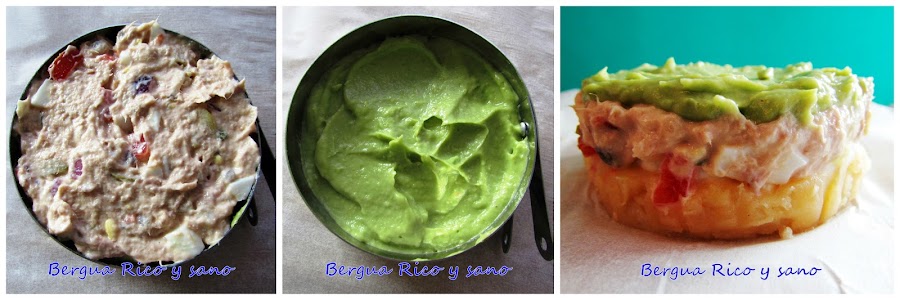 8. Todos los timbales tienen de base la patata. Sobre ésta colocamos por ejemplo el queso. Cubrimos con la ensaladilla de atún y sobre ésta servimos el aguacate, ya sea en láminas o triturado. Añadimos una capa de puré de boniato y acabamos con otra tapadera de patata.