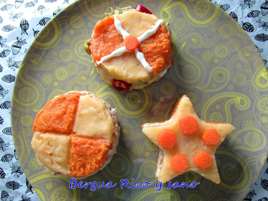 9. Como el orden de los factores no altera el producto, yo hice varios timbales con las diferentes capas en distinto orden. También podemos hacer la tapa superior de cuadros, rombos, mitades... O ya veis, en forma de estrella.