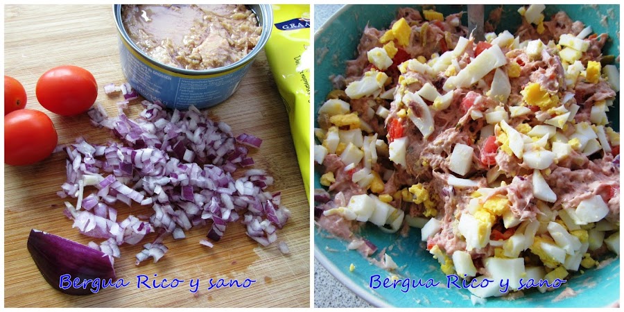 Dicen que hace mucho esta receta no llevaba relleno, sino que se acompañaba con pescado frito. Hoy en día se suele rellenar de atún, pollo cocido o mariscos. Aquí os dejo mi versión para 4 personas: