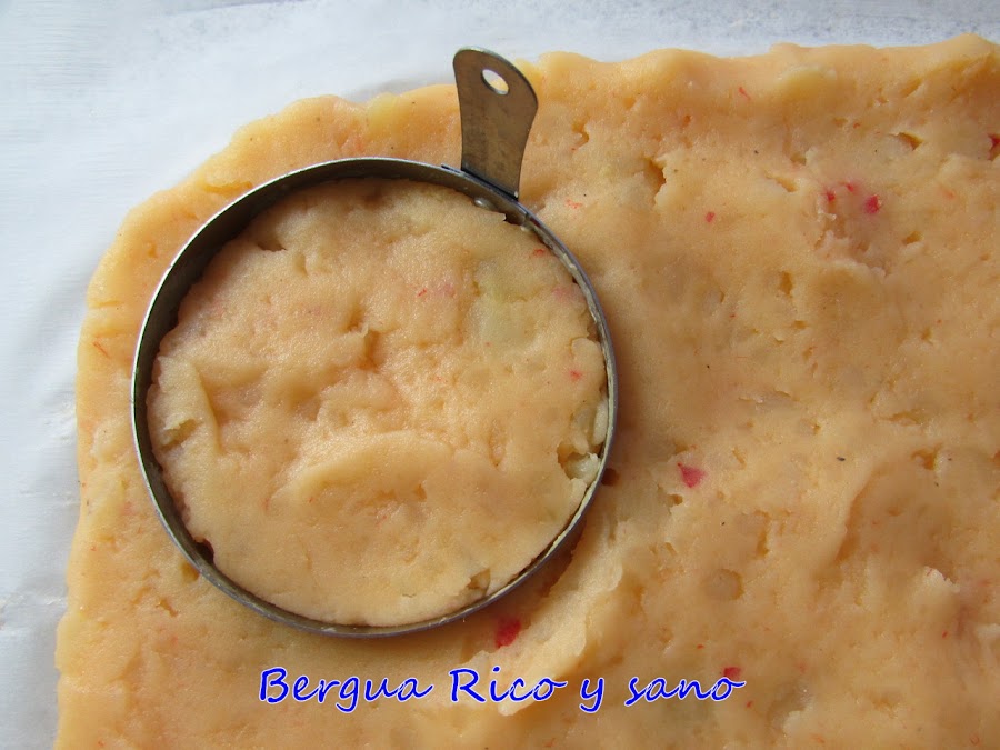 7. Si hemos trabajado bien la masa al mezclar con la emulsión, el puré de patata tendrá una consistencia fácil de manejar. La extendemos con el grosor que queramos sobre papel de hornear y de ella cortaremos las tapas de patata. La masa de boniato es menos compacta, queda como un puré común.