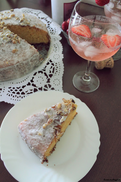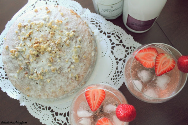 Junto a esta bebida para el postre lo acompañamos de un rico dulce compuesto por bizcocho de zanahoria con cubierta de azucar y nueces.