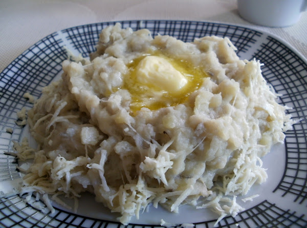 Rallamos un trozo de queso costeño, reconozco que me gusta el cayeye con mucho queso jeje... Una vez que los guineos estén suaves, los sacamos de la olla y los vamos aplastando con un tenedor. Agregamos queso al gusto y unas cuantas cucharadas del agua de la cocción, machacamos bien los guineos y nos aseguramos de que el cayeye se sienta suave y ligero. Adicionamos la mantequilla y un poco más de queso sobre el puré. Servimos inmediatamente. El puré se debe comer enseguida, si lo dejamos mucho tiempo, se torna pesado y compacto.