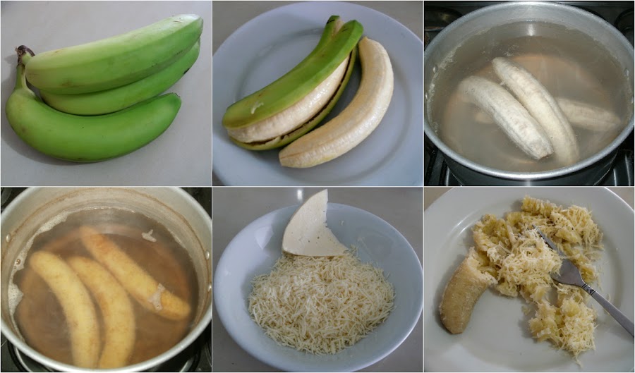 En una olla mediana ponemos a calentar abundante agua con media cucharada de sal. Entretanto, lavamos los bananos y los pelamos. Si nunca han pelado unos guineos verdes, comiencen por retirarles puntas y hagan un corte a lo largo de la cáscara, el corte debe ser profundo, pero no debe llegar a la pulpa porque partiría el banano. Con la ayuda del cuchillo van levantado la corteza y con los dedos terminan de separarla de la pulpa. Echamos los guineos en el agua hirviendo, adicionamos una cucharada de vinagre y tapamos la olla. Dejamos cocinar los bananos hasta que estén blandos.