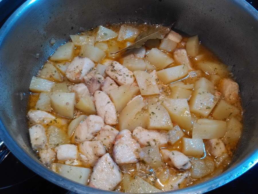 Una vez pasado el tiempo, añadimos el cazón troceado, el perejil, y volvemos a cerrar la olla durante 2 minutos más.