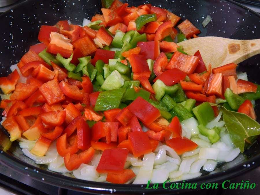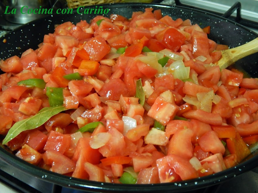 Salpimentamos nuestros trozos de cazón y los dejamos macerar. Mientras en un perol, hermoso, salteamos los ajos con el aceite de oliva a fuego medio. Cuando empiecen a dar olor, ponemos la cebolla, laurel y los pimientos, con un poco de sal para que suden y tras 4 ó 5 minutos los tomates. Paciencia, fuego lento y cariño. Vamos removiendo de vez en cuando. Al menos una hora.