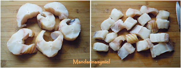 Primero de todo tienes que limpiar el cazón, quita la espina central y la piel si la tiene, y corta la carne en dados.