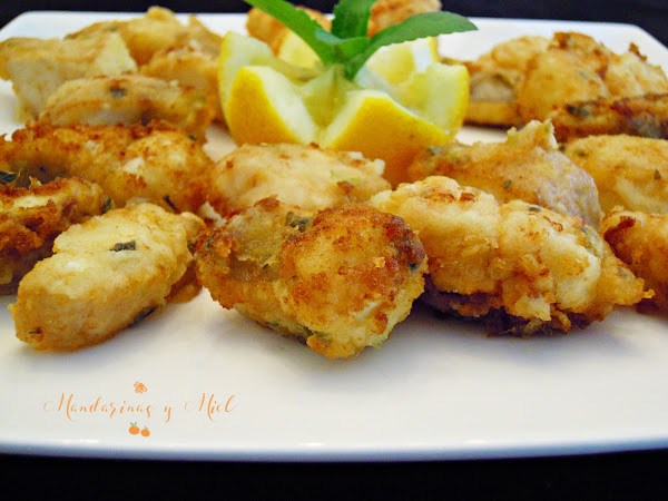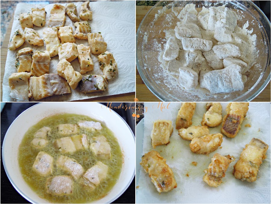 Reboza en harina los trozos de pescado y fríelos en aceite bien caliente, para que se doren por fuera pero queden jugosos por dentro.